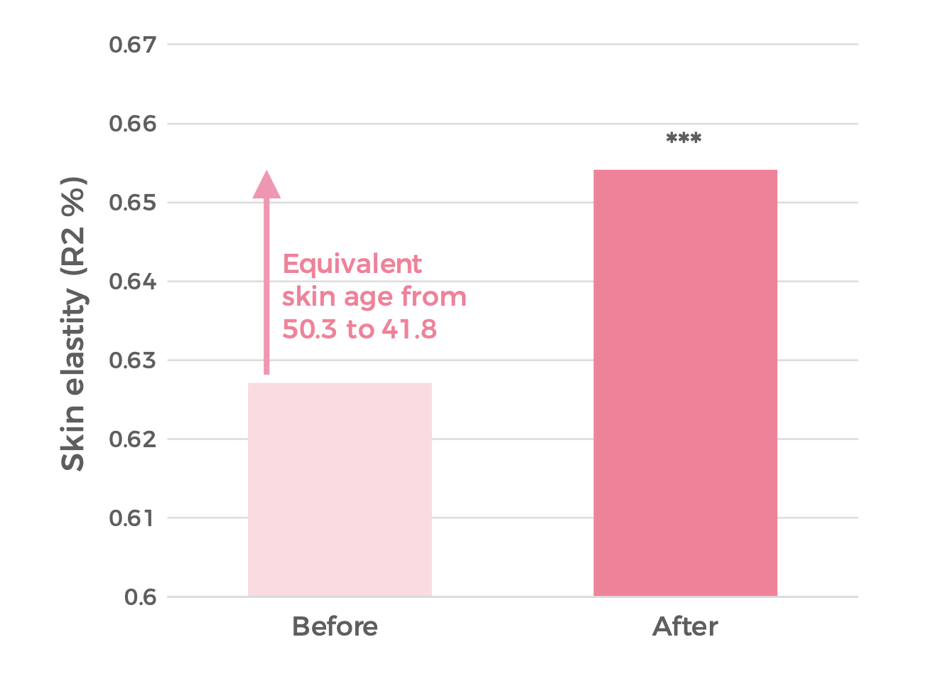 Nuvogen Symphony significantly improved (p<0.001) skin elasticity, corresponding to an equivalent reduction of 8 years in skin-age elasticity in the study dataset.1