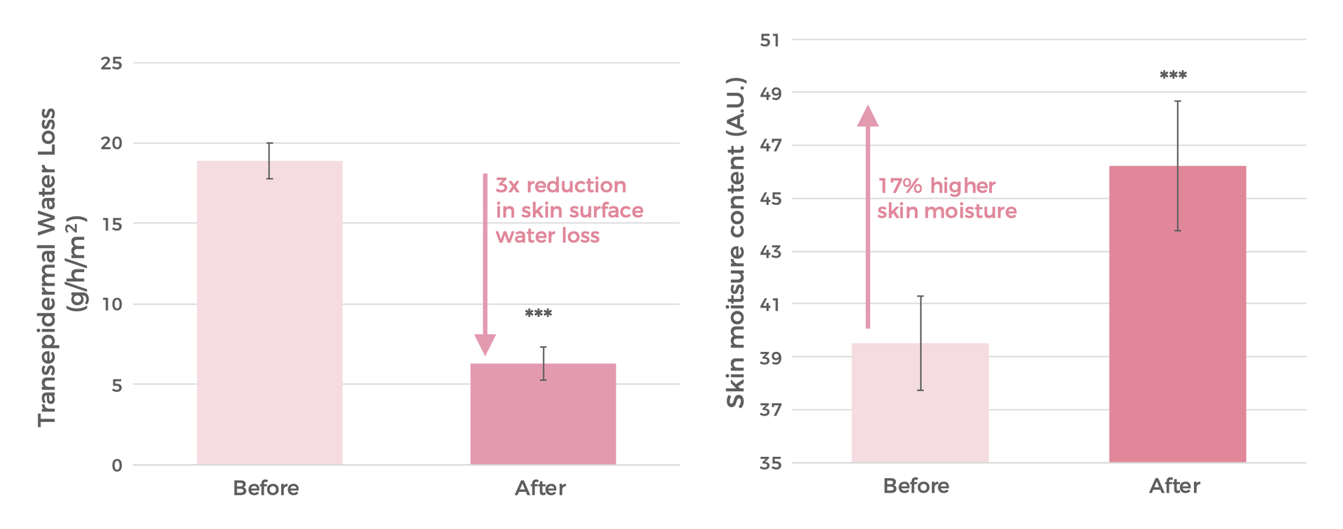 Nuvogen Symphony significantly reduced (p<0.001) skin surface water loss by 3-fold, resulting in a net skin moisture gain of 17%, restoring the skin’s natural long-term water balance.1